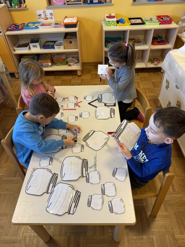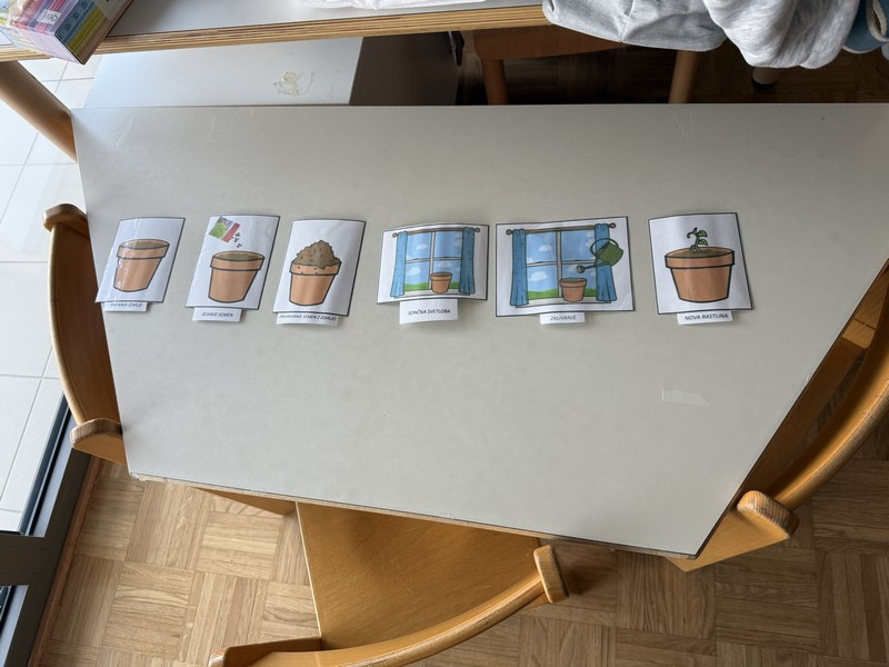 Znanje so poglabljali v senzoričnih kotičkih, kjer so razvrščali slikovni prikaz rasti, sestavljali dele rastline ter opazovali spremembe skozi čas. Z mini eksperimentom so primerjali rast v različnih pogojih (svetloba, tema, brez zalivanja) in ob opazovanju ugotavljali, v katerih razmerah rastlina uspeva bolje.