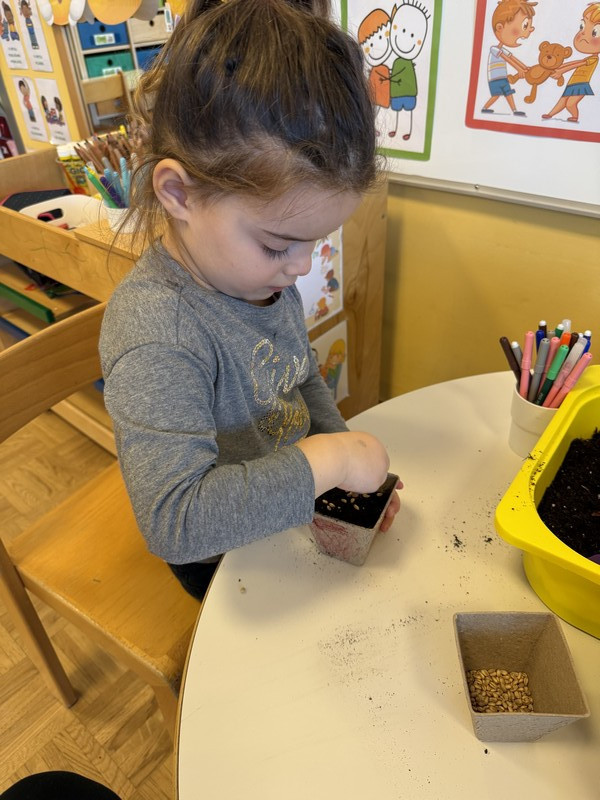 V okviru projekta Raček so otroci skozi izkustveno učenje raziskovali, kako iz majhnega semena zraste zelena rastlina. Dejavnost se je začela z obiskom škrata, ki je prinesel semena božičnega žita. Otroci so jih opazovali, tipali in ob pogovoru razmišljali o tem, kaj rastlina potrebuje za rast. Lončke so nato ustvarjalno okrasili ter jih pripravili za sajenje. Po dogovorjenem zaporedju so posejali žito – dodali zemljo, posejali semena, zalili in lončke postavili na svetlo mesto. Pri tem so razvijali natančnost, samostojnost in razumevanje pomena pravilnega zaporedja korakov.