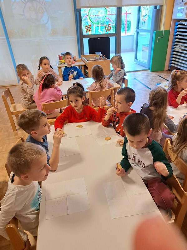 V jutranjem krogu so otroci prejeli posebno pismo škratkov, ki so jih prosili za pomoč pri peki piškotov. Pismo je pri otrocih vzbudilo veliko radovednosti in motiviranosti za reševanje izziva. Najprej so našteli sestavine, ki so potrebne za testo in potrebne pripomočke. Škratki so v pismo priložili svoj recept za piškote in otroke prosili, da sledijo zapisanim korakom izdelave. V vrtčevski kuhinji smo dobili vse potrebno, odnesli v igralnico, si nadeli predpasnike in začeli.