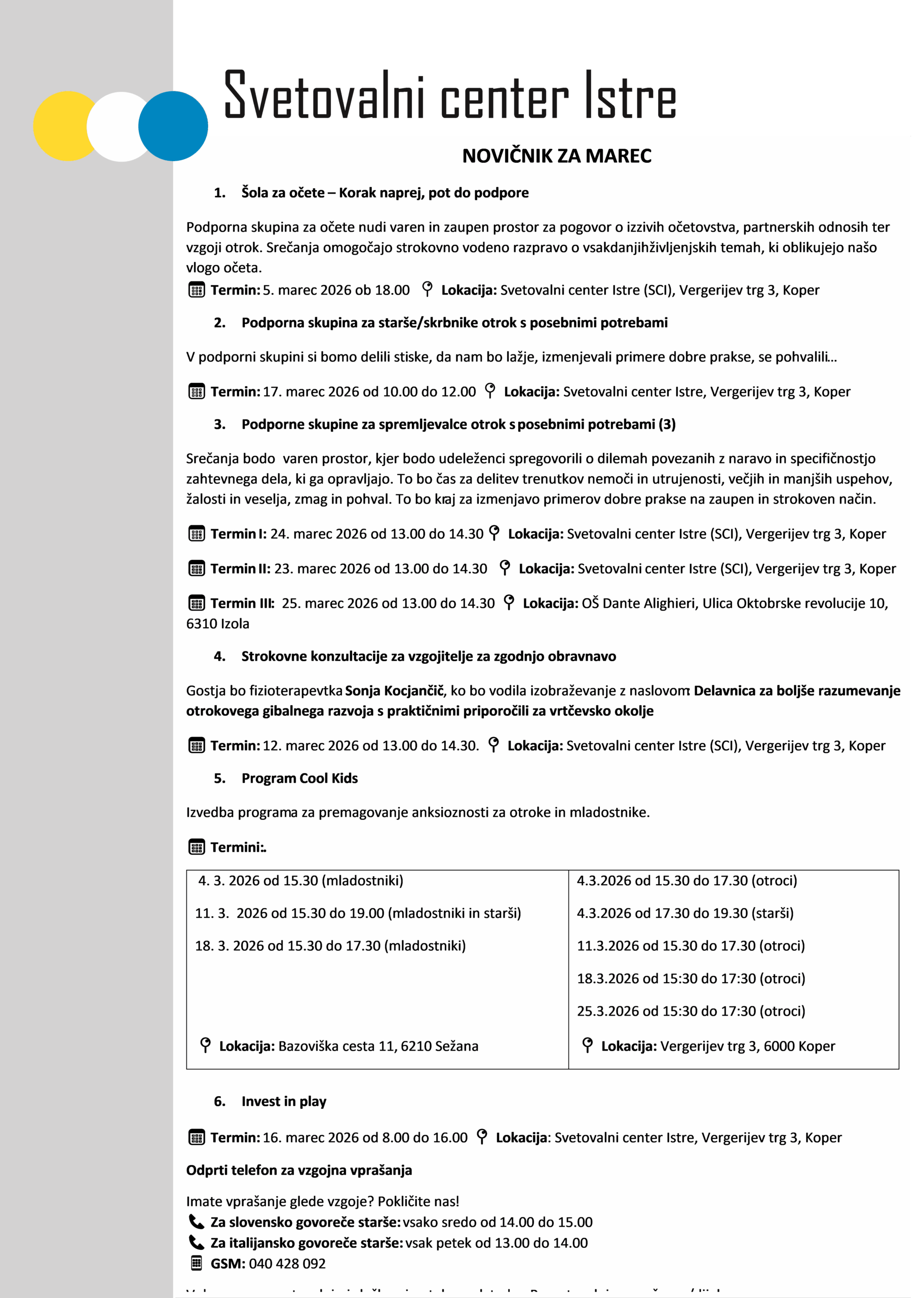 na Svetovalnem centru Istre so odprli novo ponudbo – “telefon za vzgojna vprašanja”. Namenjen je staršem predšolskih otrok, ko se srečate z vzgojno dilemo, težavo glede vzgoje ali pa morda potrebujete zgolj posvet v zvezi z otrokovim razvojem.