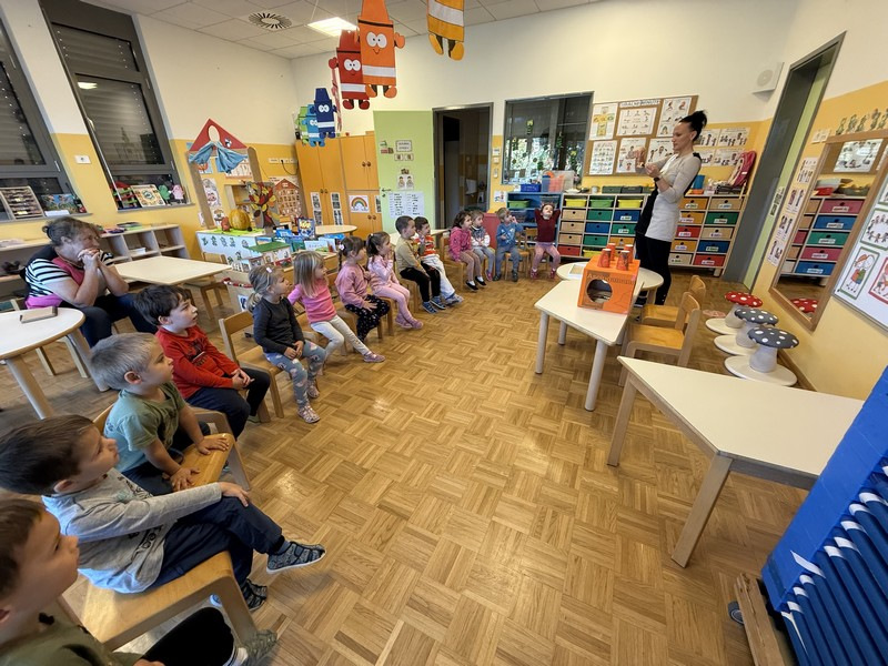 Otroci iz skupine Žabe (3–4 let) so se podali v zabavno in poučno dejavnost spoznavanja sadja, vzorcev in zaporedij.