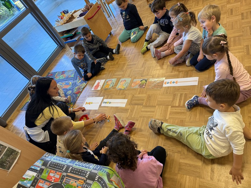 V naslednjih dneh pa je vsak otrok ustvaril tudi svoj slikovni prikaz zaporedja, z lepljenjem slik sadja. Dejavnost je bila odlična priložnost za učenje skozi igro, sodelovanje, ustvarjalnost in razumevanje zaporedij.