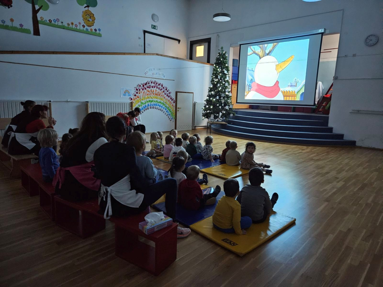 - V sredo, 17. decembra, so si otroci v telovadnici ogledali risanko Sneženi mož po zgodbi H. C. Andersena, pri čemer je bil ogled organiziran v dveh časovnih terminih glede na posamezne oddelke.