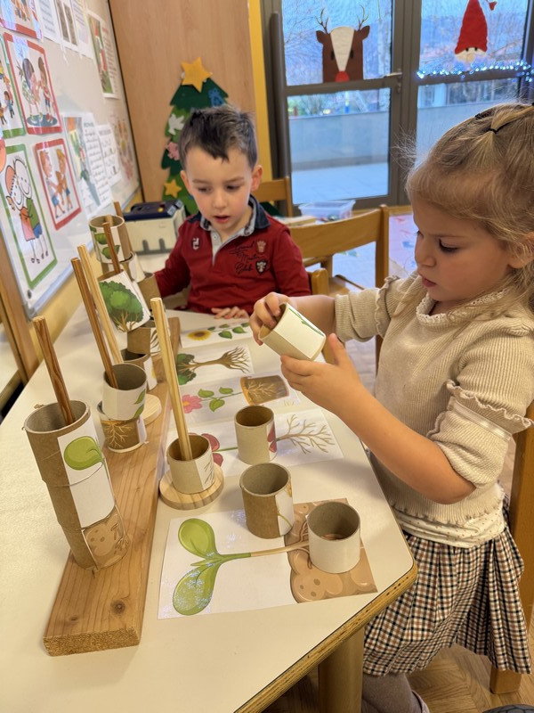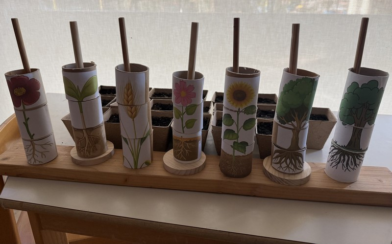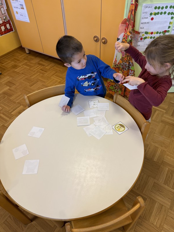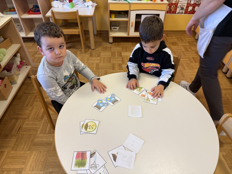 Znanje so poglabljali v senzoričnih kotičkih, kjer so razvrščali slikovni prikaz rasti, sestavljali dele rastline ter opazovali spremembe skozi čas. Z mini eksperimentom so primerjali rast v različnih pogojih (svetloba, tema, brez zalivanja) in ob opazovanju ugotavljali, v katerih razmerah rastlina uspeva bolje.