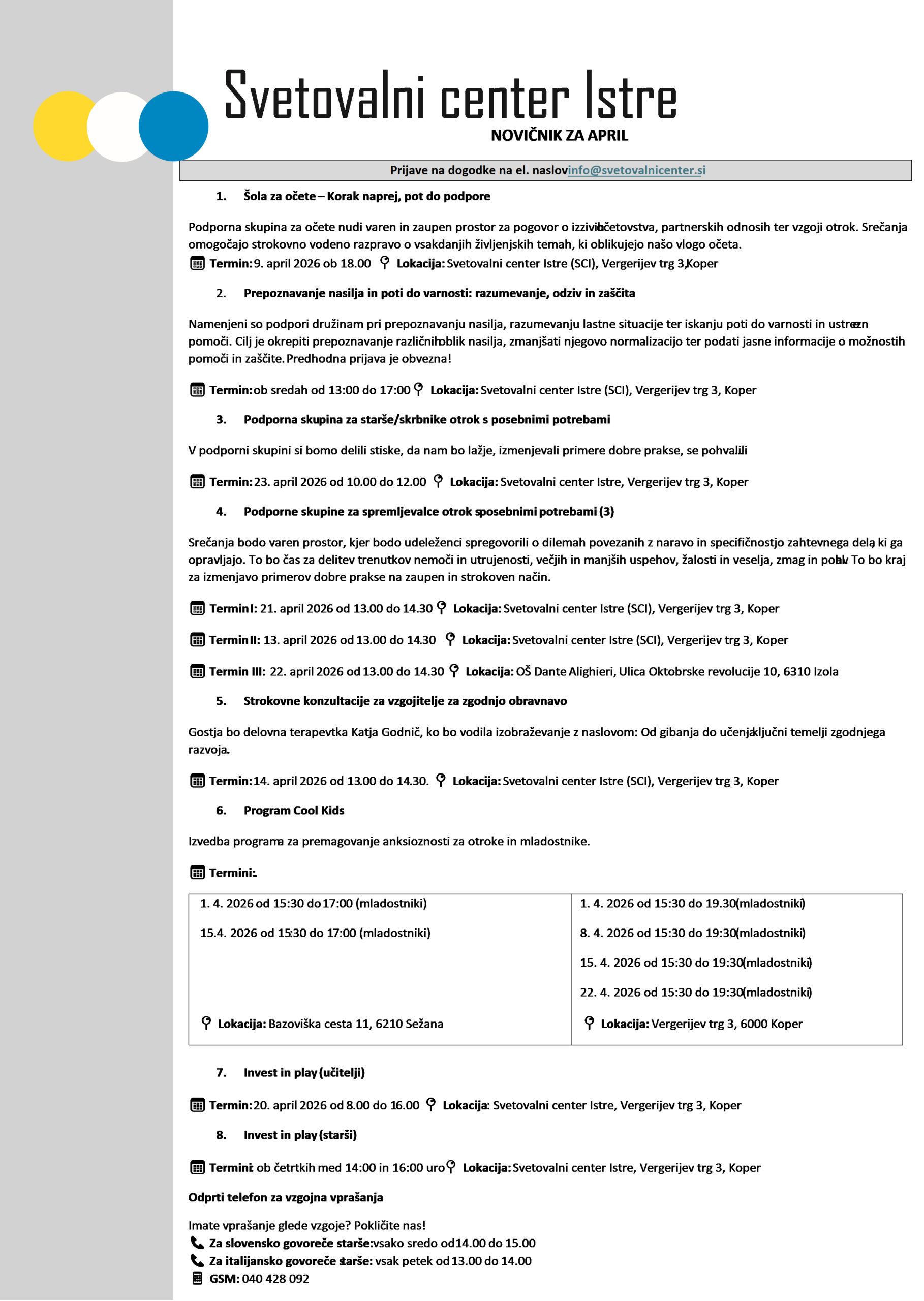 na Svetovalnem centru Istre so odprli novo ponudbo – “telefon za vzgojna vprašanja”. Namenjen je staršem predšolskih otrok, ko se srečate z vzgojno dilemo, težavo glede vzgoje ali pa morda potrebujete zgolj posvet v zvezi z otrokovim razvojem.