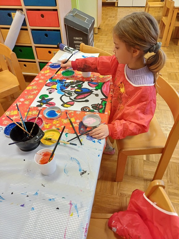 Zelo uspešna je bila tudi reprodukcija slik Joana Miroja, pri kateri so sodelovale vse skupine. Mlajši otroci so ustvarjali skupinsko, starejši pa individualno, nekateri so celo poskusili reproducirati več slik. Razstava teh del je bila odlično sprejeta – otroci so si jo lahko ogledali skupaj s starši ob prijetni instrumentalni glasbi, kar je ustvarilo vtis prave galerije. Galerijo so obiskali tudi šolarji, njena impresivnost pa nas je prepričala, da smo jo pustili na ogled do konca meseca marca.