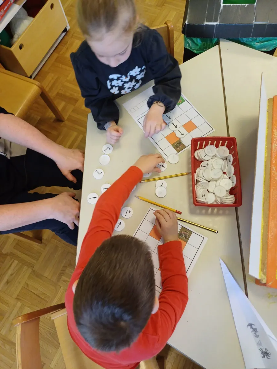 Algoritemsko mišljenje – Otroci so sestavljali natančna navodila (zaporedja ukazov) za robota ali kmeta, da doseže cilj. Prepoznavali so napake in popravljali napačne ukaze. Sledili so zapisanim korakom in sami rešili nalogo – posadijo svojo rastlino.