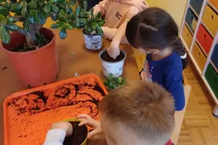 Otroci so samostojno posadili vršičke rastlin po slikovnih navodilih. Rezanje vršičkov je opravila vzgojiteljica. Otroci so napolnili lonček z zemljo, naredili luknjo, vstavili vršiček, pritisnili zemljo in zalili.